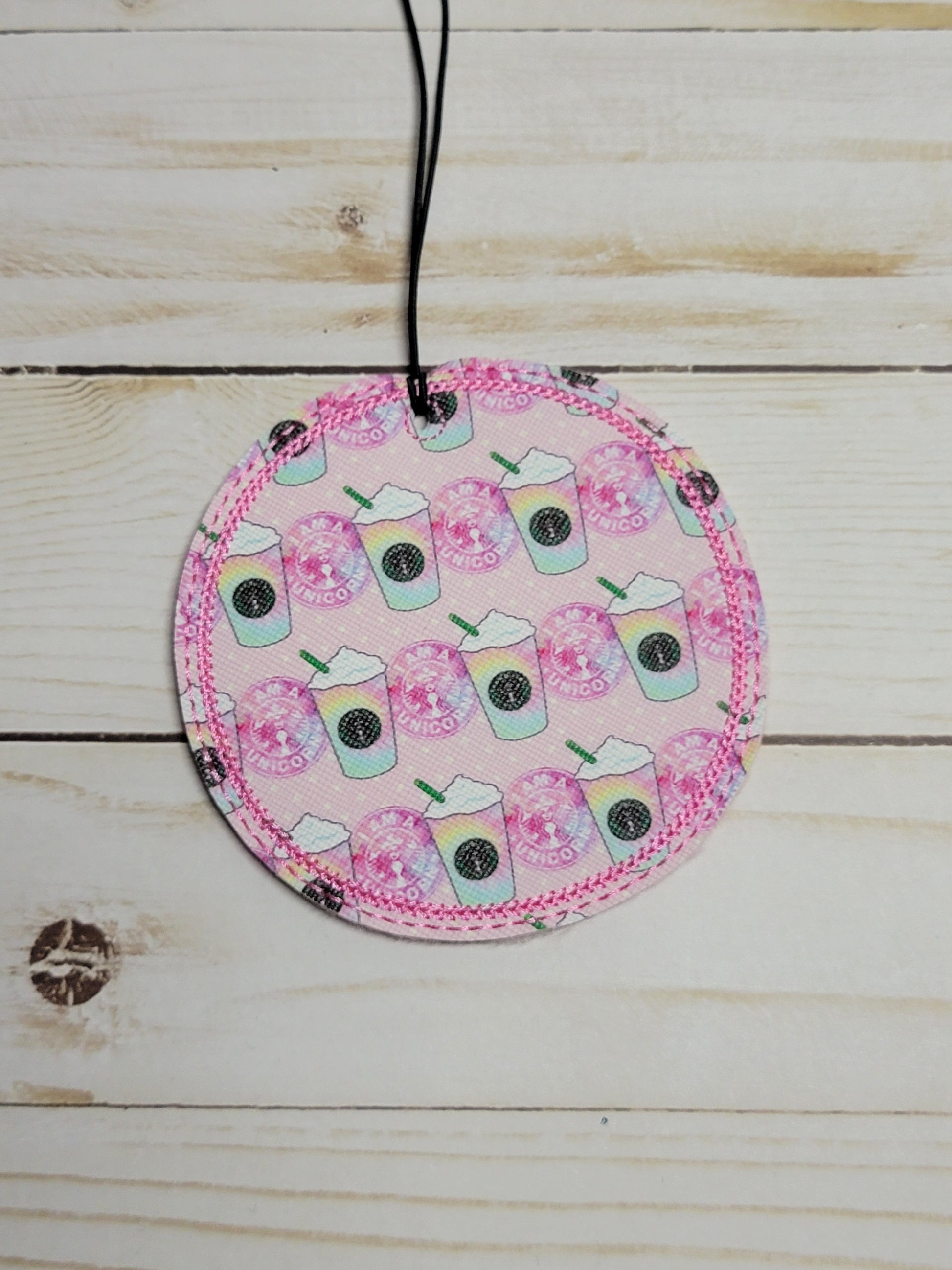 Car freshies have a marine vinyl front and a felt backing as well as an elastic string to hang.